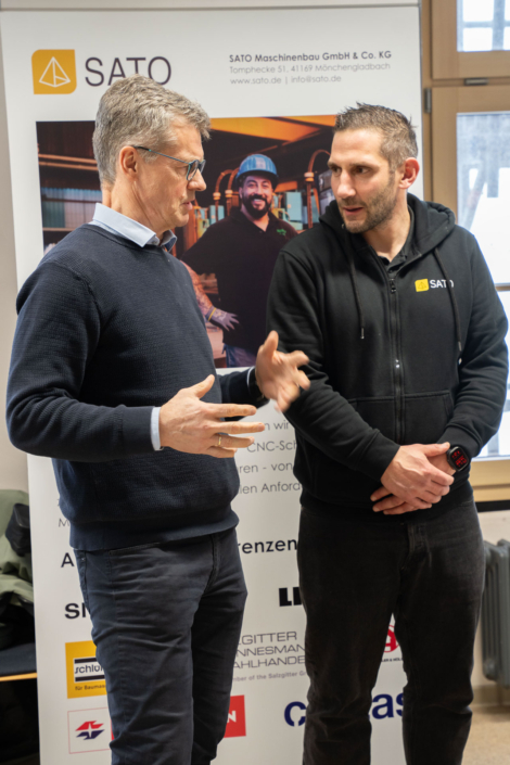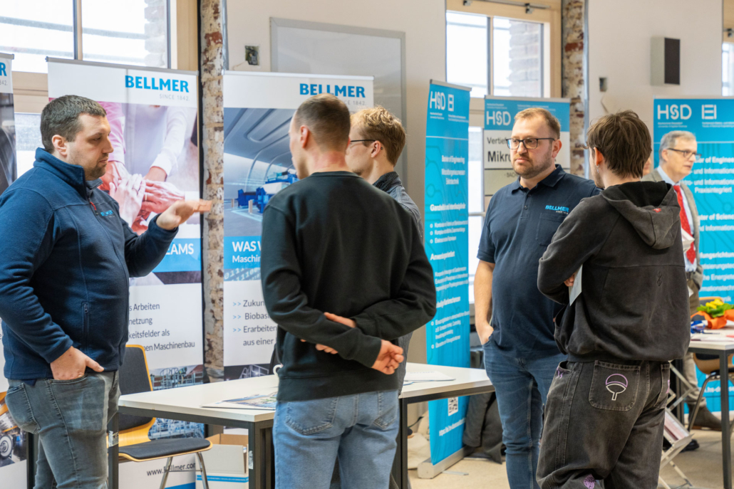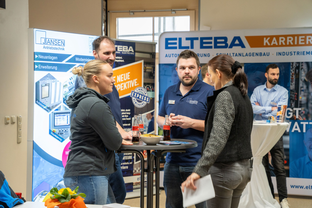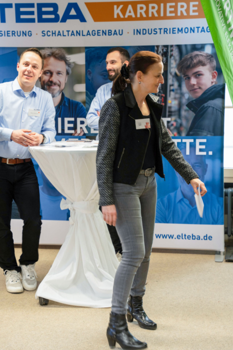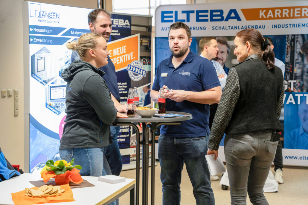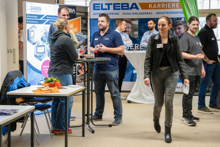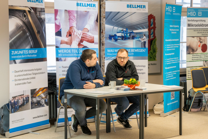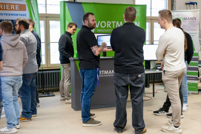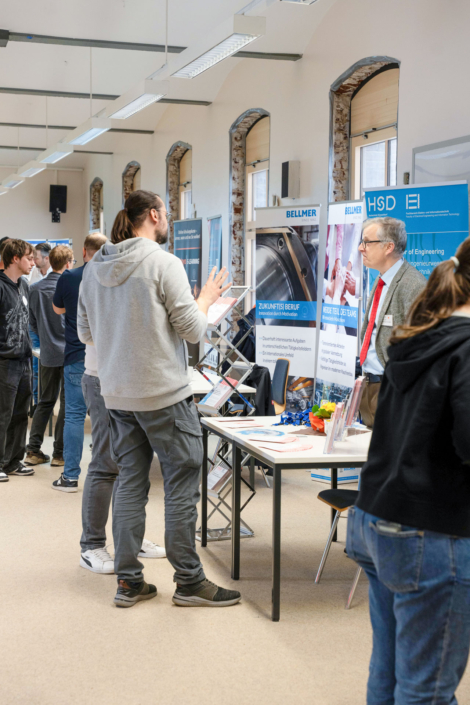 „Die Auftragslage hat derzeit sicherlich Luft nach oben“, sagt Ernst-Jan Oellers, der die Firma Bellmer vertritt, „aber wir wissen, dass zahlreiche Mitarbeiter der Boomer-Generation demnächst in Rente gehen und so suchen wir vor allem Mitarbeiter in der Automatisierung und der Konstruktion.“ Auch Frau Wilde von der SMS-Group spricht die verhaltende Wirtschaftslage offen an. „Wir suchen eher spezialisierte Kolleginnen und Kollegen im Bereich Elektrotechnik und Mechatronik, auch Programmierer sind immer herzlich willkommen.“ Einen Stand weiter, bei der Firma Hell, treffen die angehenden Techniker auf einen ehemaligen Absolventen der Fachschule, Herrn Mika. Er weiß genau, warum er seine Firma auf die Firmenmesse aufmerksam gemacht hat, denn schließlich kennt er die qualitativ ausgezeichnete Ausbildung, die die Techniker an unserer Schule erhalten, aus eigener Erfahrung. „Wir befinden uns auf Expansionskurs. In der Baubranche herrscht eine sehr gute Auftragslage. Wir suchen daher vor allem Automatisierer und Projektleiter! Bestimmt gibt es da Interessenten.“