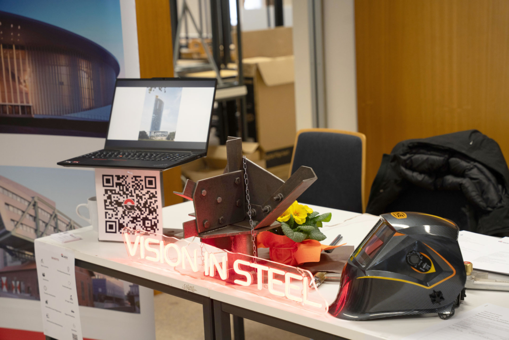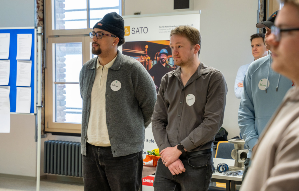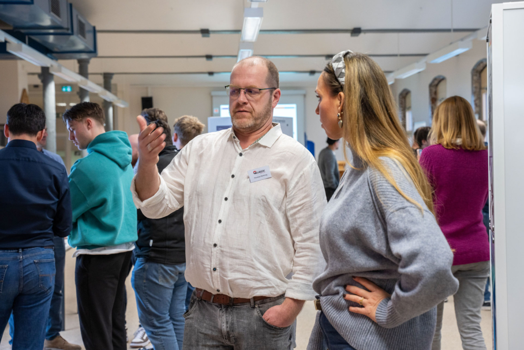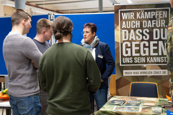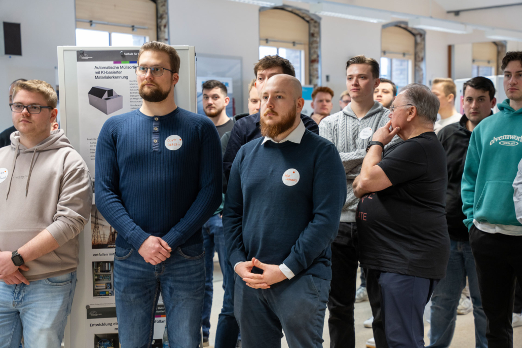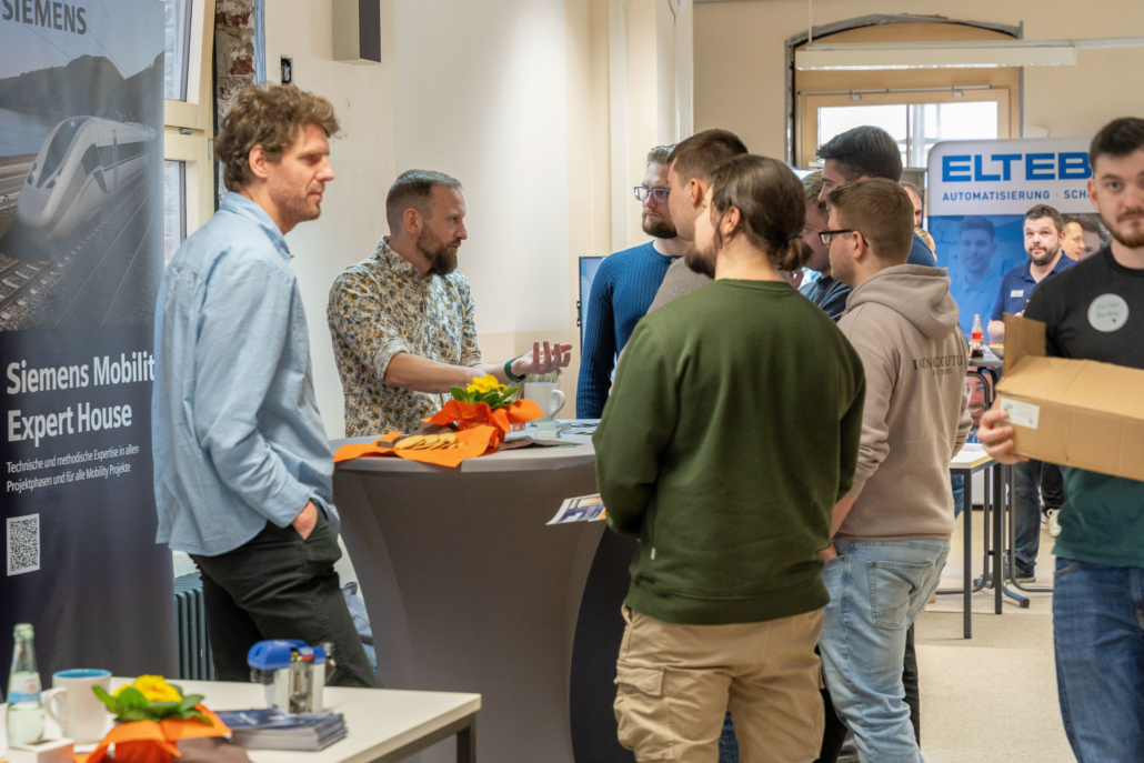 „Die Auftragslage hat derzeit sicherlich Luft nach oben“, sagt Ernst-Jan Oellers, der die Firma Bellmer vertritt, „aber wir wissen, dass zahlreiche Mitarbeiter der Boomer-Generation demnächst in Rente gehen und so suchen wir vor allem Mitarbeiter in der Automatisierung und der Konstruktion.“ Auch Frau Wilde von der SMS-Group spricht die verhaltende Wirtschaftslage offen an. „Wir suchen eher spezialisierte Kolleginnen und Kollegen im Bereich Elektrotechnik und Mechatronik, auch Programmierer sind immer herzlich willkommen.“ Einen Stand weiter, bei der Firma Hell, treffen die angehenden Techniker auf einen ehemaligen Absolventen der Fachschule, Herrn Mika. Er weiß genau, warum er seine Firma auf die Firmenmesse aufmerksam gemacht hat, denn schließlich kennt er die qualitativ ausgezeichnete Ausbildung, die die Techniker an unserer Schule erhalten, aus eigener Erfahrung. „Wir befinden uns auf Expansionskurs. In der Baubranche herrscht eine sehr gute Auftragslage. Wir suchen daher vor allem Automatisierer und Projektleiter! Bestimmt gibt es da Interessenten.“