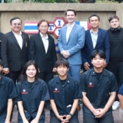 Fasziniert erzählen die Kolleginnen und Kollegen auch von der Teilnahme an der Morgenzeremonie des Colleges, mit der jeder Schultag beginnt. Alle Schülerinnen und Schüler der Schule versammeln sich sitzend auf einer großen Freifläche. Zuvor verteilen Mitarbeiter an diesem Donnerstag Essensspenden an die zahlreichen buddhistischen Mönche, die in orangerote Gewänder gekleidet, an langen Tischen die Spenden entgegennehmen. Um 8 Uhr steht das gesamte öffentliche Leben für die Nationalhymne still. Es folgen die Vermeldungen des Tages oder wie an diesem Tag, die Begrüßung der deutschen Delegation mit dem deutschen Botschafter Jan Scheer, Vertretern der Deusch-Thailändischen Handelskammer, Markus Hoffmann CIM Fachkraft im ExperTS Programm und mit der feierlichen Unterzeichnung des MOU, des Memorandums of Understanding durch Frau Battenstein als Schulleiterin und Herrn Prasert Klinchoo, Direktor des E-Tech Colleges.