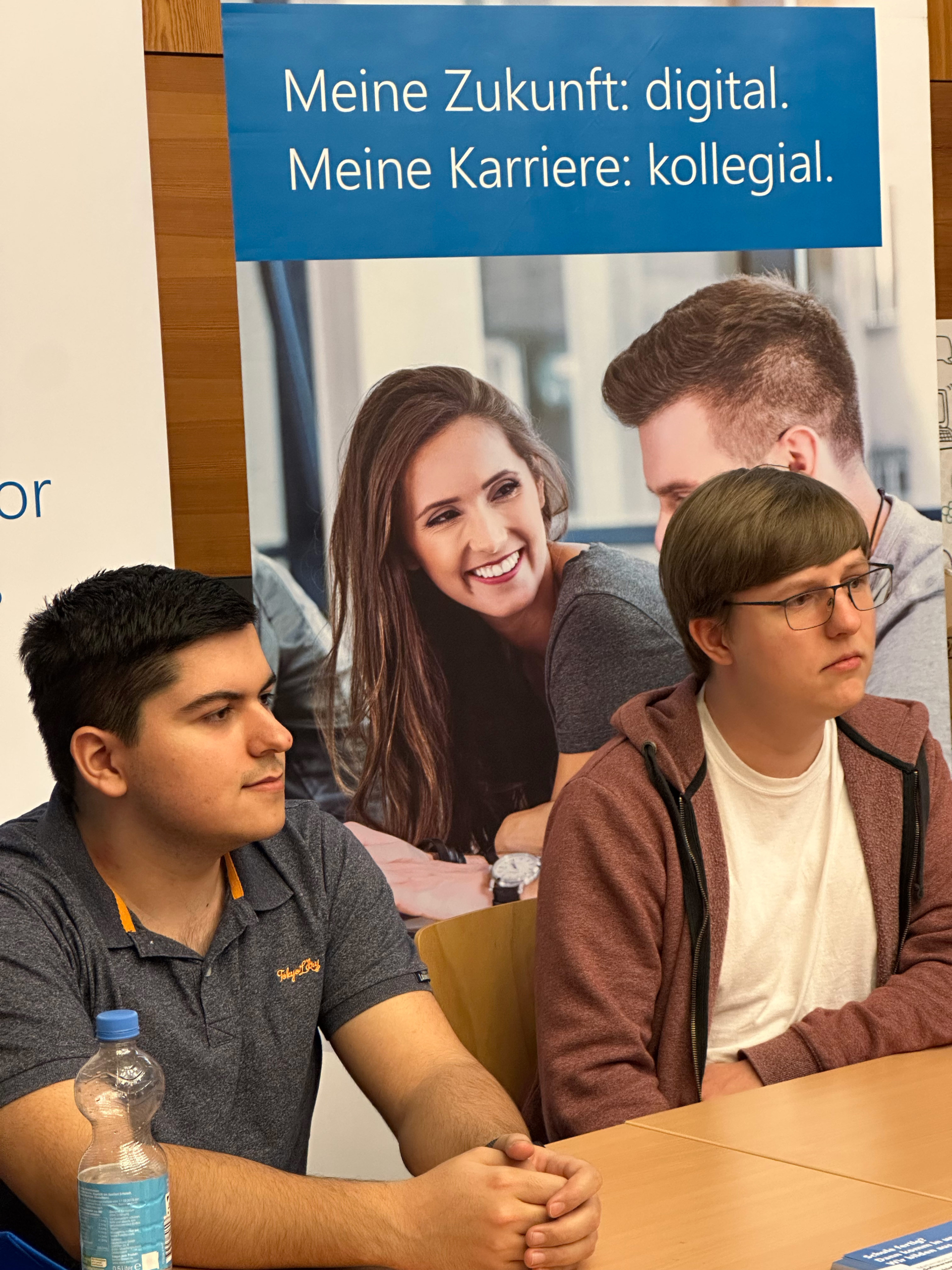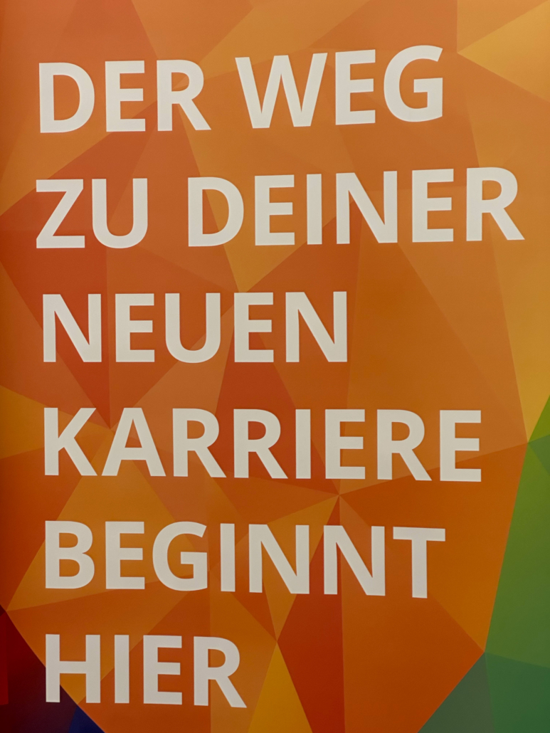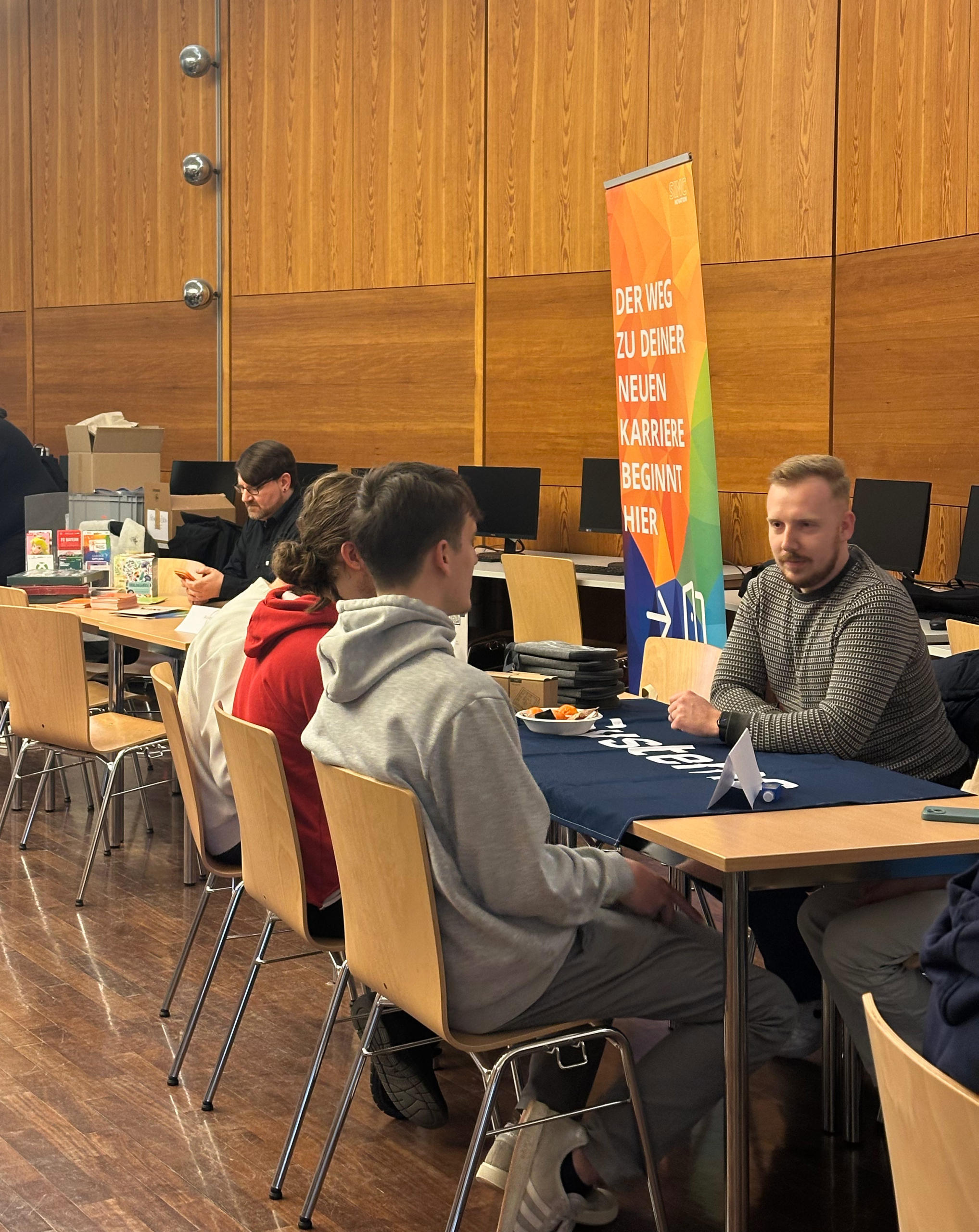 In der Aula herrscht eine konzentrierte, neugierige und offene Atmosphäre. Zahlreiche, locker im Rund arrangierte Tische, laden zu persönlichen Gesprächen ein, an einigen wird gelacht und lebhaft diskutiert. Firmen aus Mönchengladbach, die Arbeits- und Ausbildungsplätze im IT-Bereich anbieten, sind der Einladung unserer Schule, speziell unseren Informationstechnischen Assistentinnen und – assistenten zu einer Praktikums- und Ausbildungsplatzbörse gefolgt.