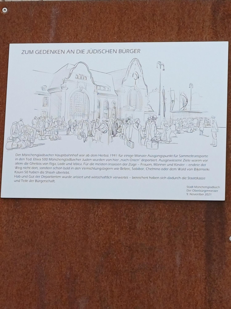 „Zu Beginn unseres Rundgangs sind wir gemeinsam als Klasse zum Hauptbahnhof gegangen, um dort die erste Gedenkstätte für die Opfer der Judenverfolgung zu besuchen. Eine schlichte, aber eindrucksvolle Tafel erinnert an das Leid und Unrecht, das an diesem Ort begann (siehe Bild). Unser zweiter Halt führte uns zur Alten Stadtbibliothek. Dort entdeckten wir mehrere Gedenkstätten, die an die schrecklichen Ereignisse der Reichspogromnacht am 9. November 1938 erinnern (siehe Bild 2). Eine der Tafeln trug die berührende Inschrift: